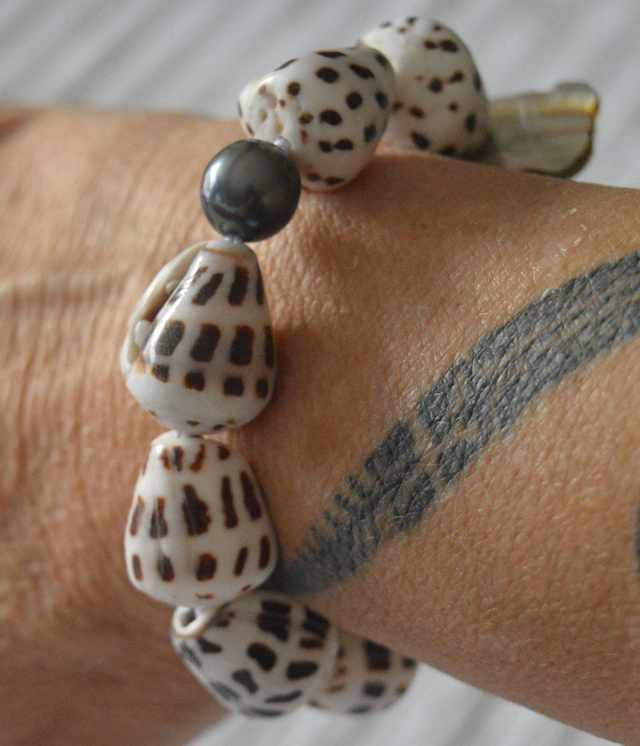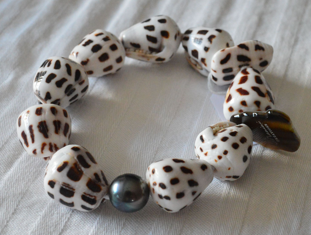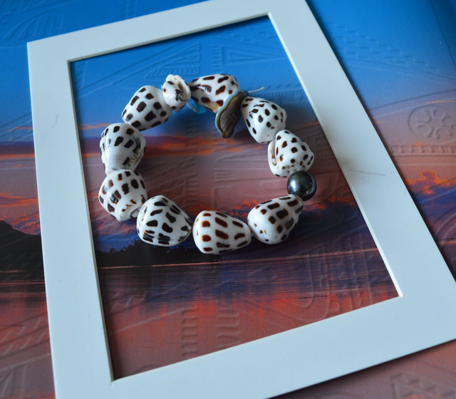 Bracelet coquillages blancs tachetés marron - perle de Tahiti - élastiqué - diamètre 5 cm
